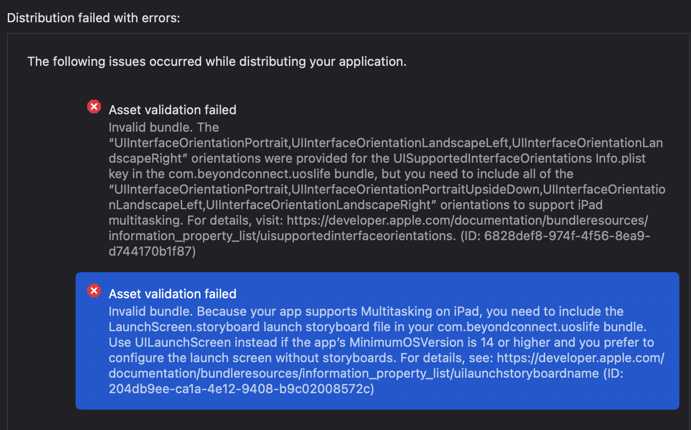 Invalid bundle. The "UlInterfaceOrientationPortrait,UlInterfaceOrientationLandscapeLeft,UlInterfaceOrientationLan dscapeRight" orientations were provided for the UISupportedInterfaceOrientations Info.plist key~